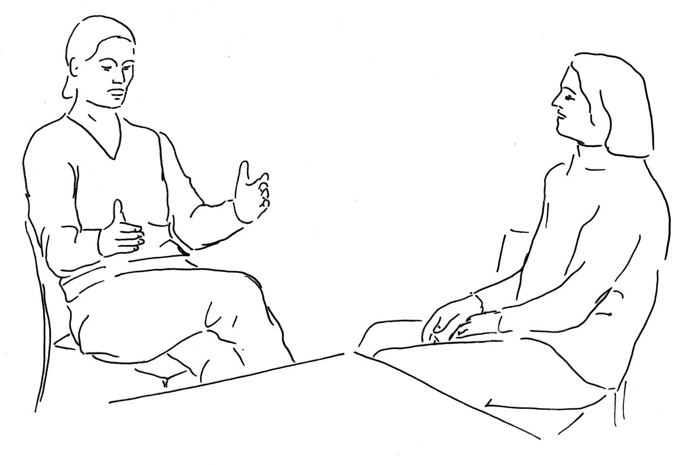Die Hände beider Sprecherinnen erzeugen gleichzeitig ein gemeinsames Modell des Potsdamer Platzes. Die Hände der linken Kommunikationspartnerin repräsentieren eine Kreuzung, auf die die rechte Sprecherin zeigt.